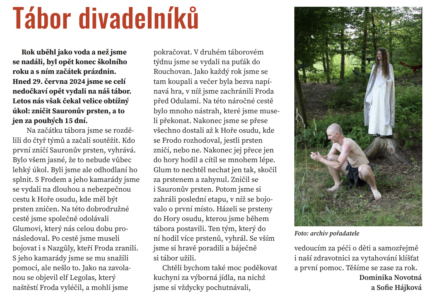 Rok uběhl jako voda a než jsme se nadáli, byl opět konec školního roku a s ním začátek prázdnin. Hned 29. června 2024 jsme se celí nedočkaví opět vydali na náš tábor. Letos nás však čekal velice obtížný úkol: zničit Sauronův prsten, a to jen za pouhých 15 dní.